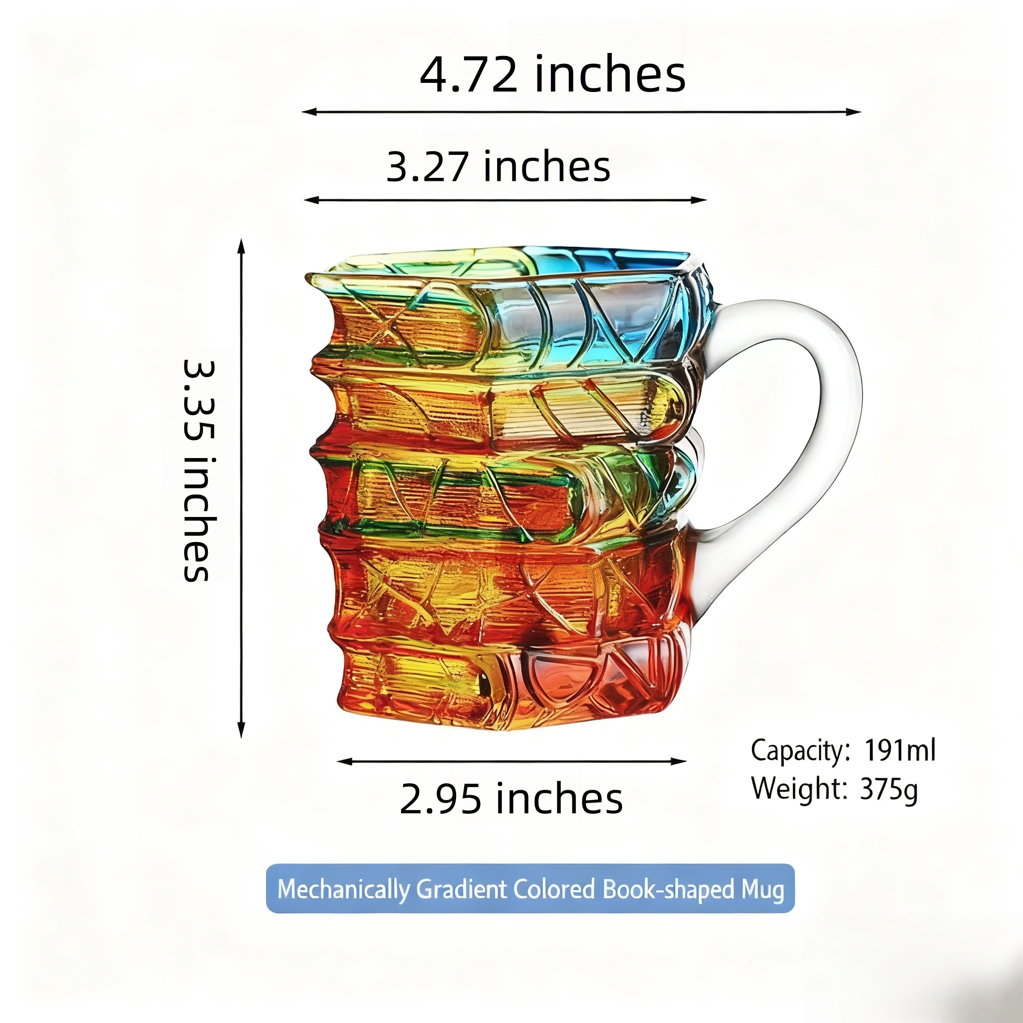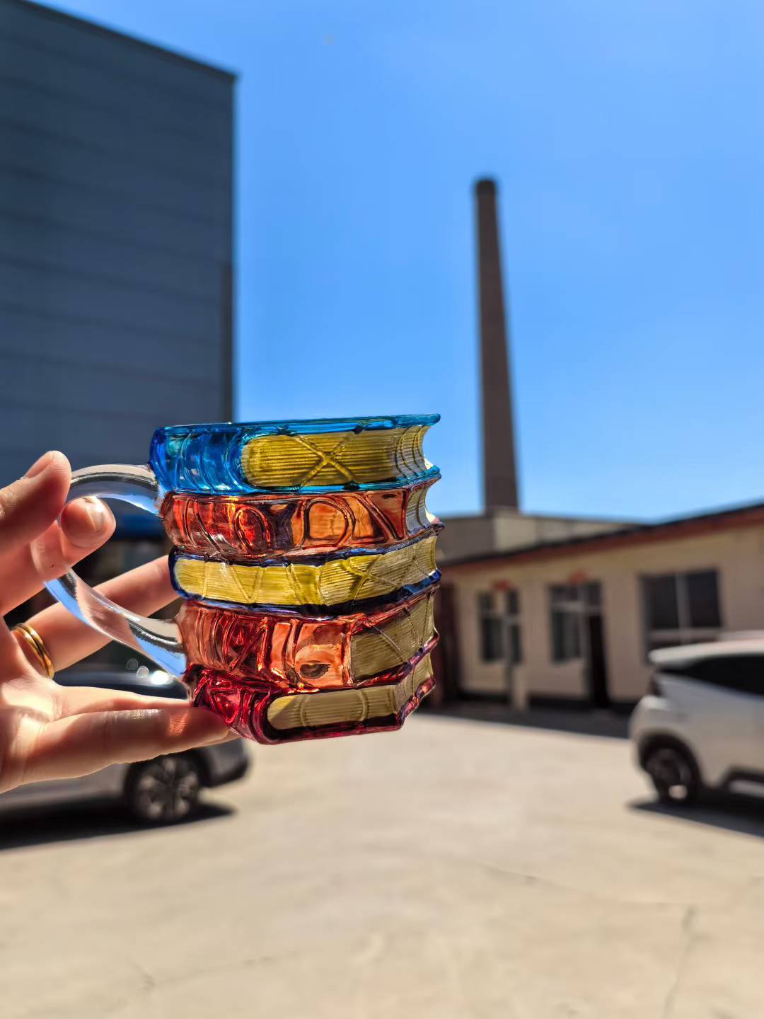 Тази чаша е с уникален дизайн от подредени книги, като всяка „книга“ е с живи, лъскави цветове – от наситено синьо до топли оранжеви и наситени червени. Висококачественият стъклен материал ѝ придава елегантен, прозрачен вид, а детайлната изработка прави всеки „гръб на книгата“ и „страница“ да изглеждат невероятно реалистично. Когато светлината я удари, чашата блести красиво, добавяйки нотка магия към вашето пространство.